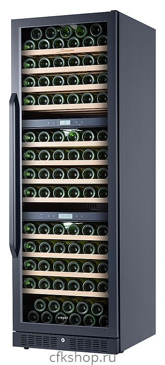 Винный шкаф Libhof Sommelier SOT-152 предназначен для хранения при оптимальных условиях бутилированного вина различных сортов в барах, ресторанах, специализированных магазинах, подсобных складских помещениях, а также в домашних условиях. Модель оснащена холодильной камерой с 3 температурными зонами, 12 съемными полками, запираемой на ключ дверью на внешних петлях, съемной цокольной решеткой, прозрачным обзорным остеклением, сенсорной панелью управления и дисплеем для каждой зоны. Корпус выполнен из металла, полки - из натурального бука.