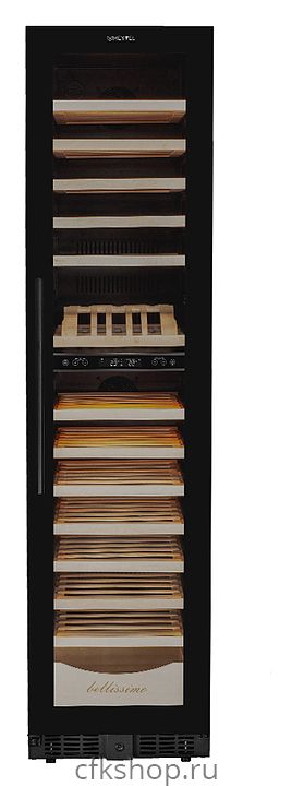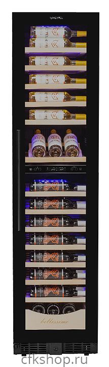 Винный шкаф MEYVEL MV106-KBT2 (Slim) предназначен для демонстрации, хранения и создания оптимальных условий для сохранения всех вкусовых свойств вина в бутылках на предприятиях общественного питания, торговли, в барах, ресторанах, специализированных магазинах, частных домах или квартирах. Модель оснащена сенсорной панелью управления, электронным термостатом и внутренней светодиодной подсветкой. Корпус и дверная ручка выполнены из окрашенной в черный цвет стали, дверь - из тройного стекла с УФ защитой с черной рамкой, полки - из массива бука.
