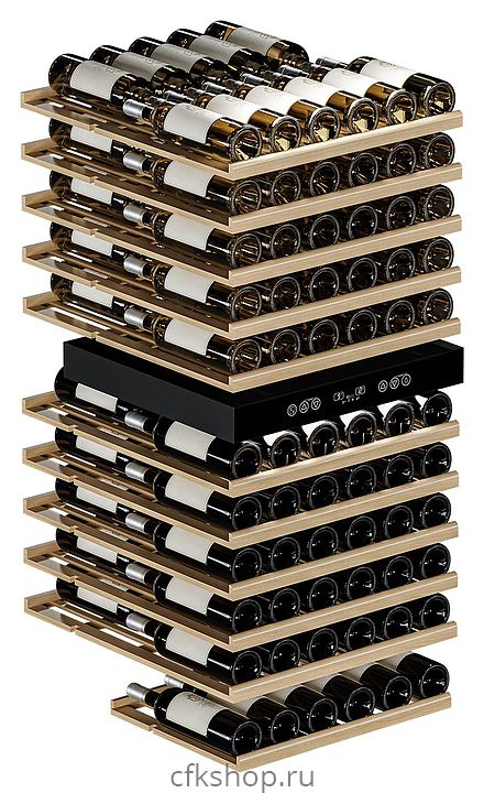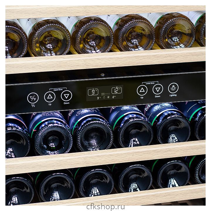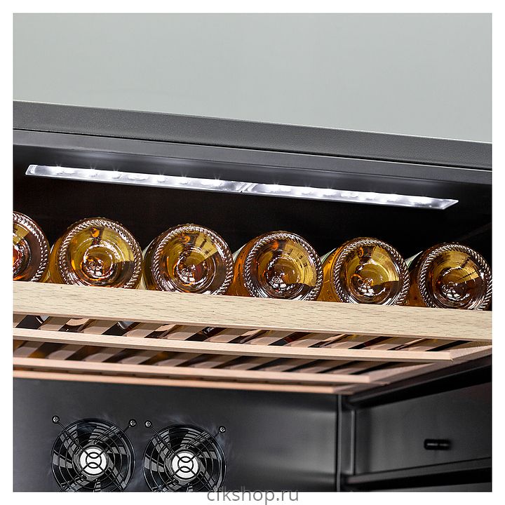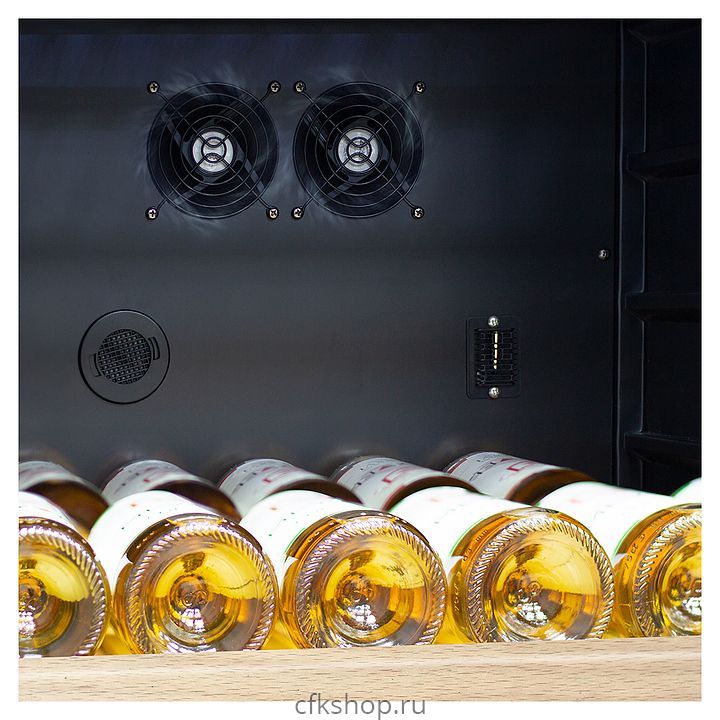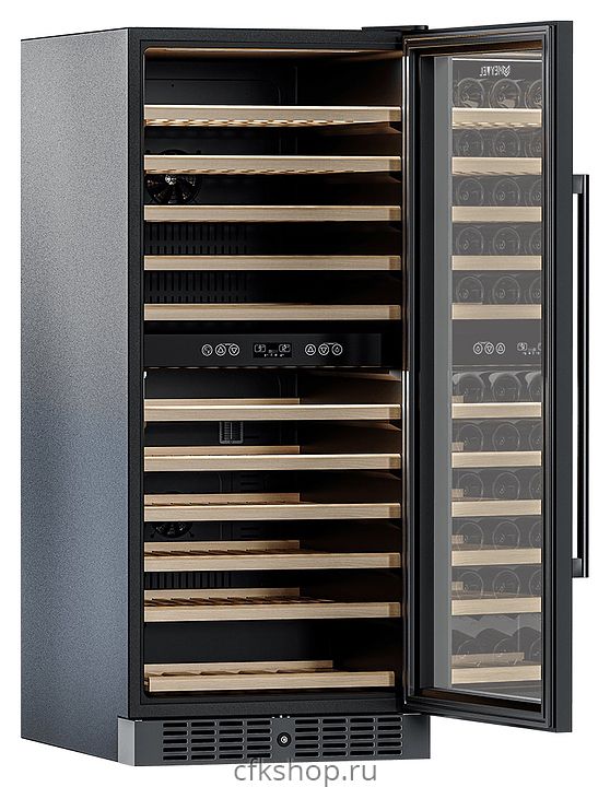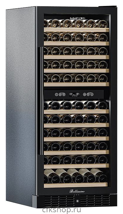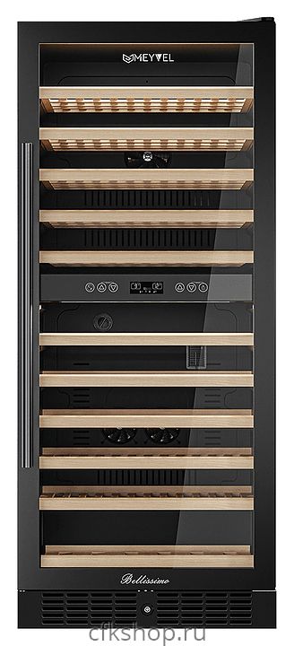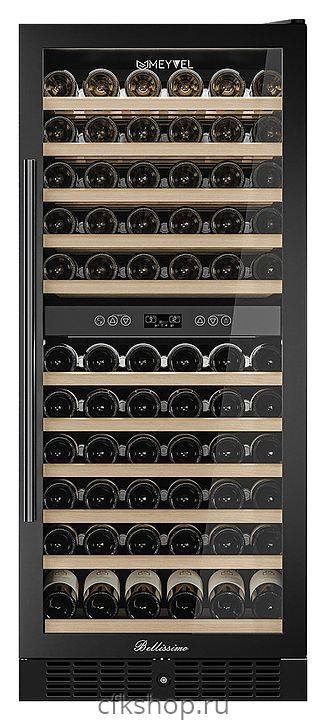 Винный шкаф MEYVEL MV116-KBT2 предназначен для демонстрации, хранения и создания оптимальных условий для сохранения всех вкусовых свойств вина в бутылках на предприятиях общественного питания, торговли, в барах, ресторанах, специализированных магазинах, частных домах или квартирах. Модель оснащена сенсорной панелью управления, 2 электронными термостатами и внутренней светодиодной подсветкой. Корпус и дверная ручка выполнены из окрашенной в черный цвет стали, дверь - из тройного стекла с УФ защитой с черной рамкой, полки - из массива бука.