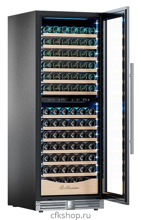 Винный шкаф MEYVEL MV141PRO-KST2 предназначен для демонстрации, хранения и создания оптимальных условий для сохранения всех вкусовых свойств вина в бутылках на предприятиях общественного питания, торговли, в барах, ресторанах, специализированных магазинах, частных домах или квартирах. Модель оснащена сенсорной панелью управления, электронным термостатом, понорамной светодиодной подсветкой, замком, угольным фильтром, 12 выкатными полками и регулируемыми по высоте ножками. Корпус выполнен из окрашенной в черный цвет стали, дверь - из тройного стеклопакета с УФ защитой, полки - из массива бука.