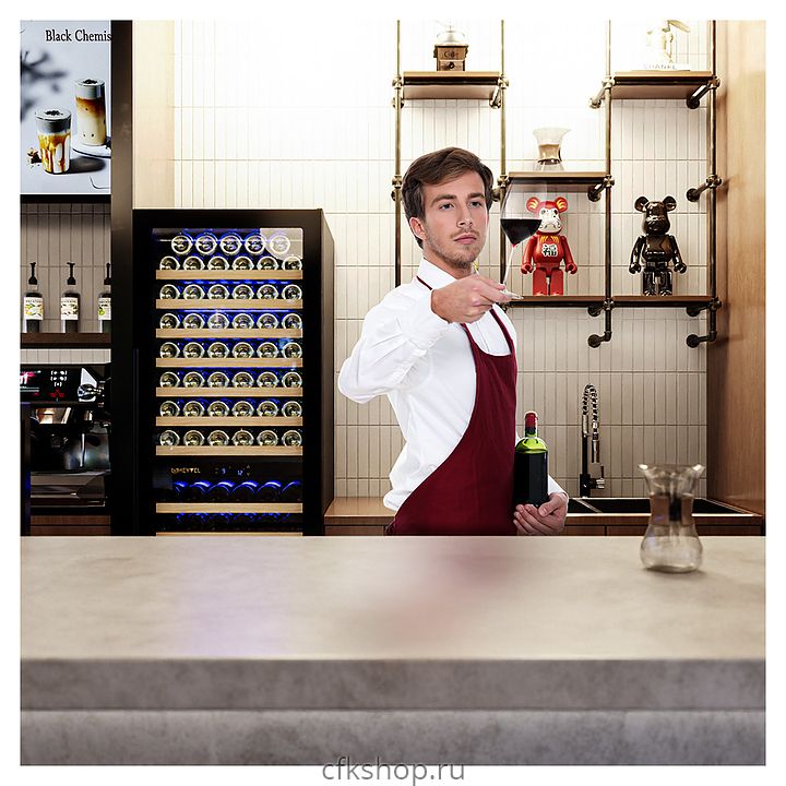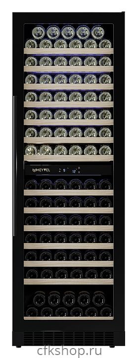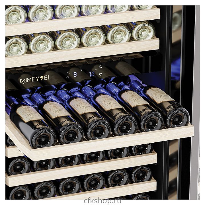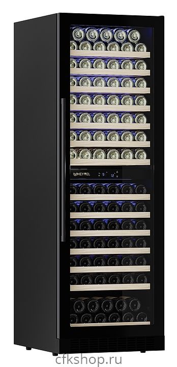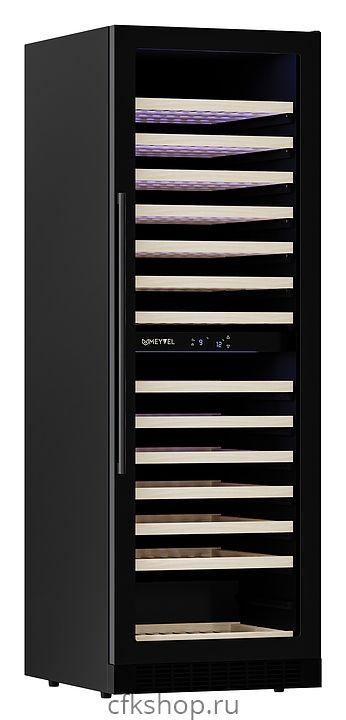 Винный шкаф MEYVEL MV163-KBT2 предназначен для демонстрации, хранения и создания оптимальных условий для сохранения всех вкусовых свойств вина в бутылках на предприятиях общественного питания, торговли, в барах, ресторанах, специализированных магазинах, частных домах или квартирах. Модель оснащена сенсорной панелью управления, электронным термостатом и синей внутренней светодиодной подсветкой. Корпус и дверная ручка выполнены из окрашенной в черный цвет стали, дверь - из двойного стекла с УФ защитой с черной рамкой, полки - из массива бука.