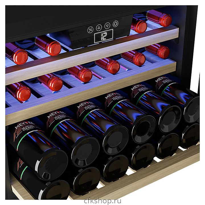 Винный шкаф MEYVEL MV22-KBB1 предназначен для демонстрации, хранения и создания оптимальных условий для сохранения всех вкусовых свойств вина в бутылках на предприятиях общественного питания, торговли, в барах, ресторанах, специализированных магазинах, частных домах или квартирах. Модель оснащена сенсорной панелью управления, электронным термостатом и внутренней светодиодной подсветкой. Корпус и дверная ручка выполнены из окрашенной в черный цвет стали, дверь - из двойного стекла с УФ защитой с черной рамкой, полки - из массива бука.