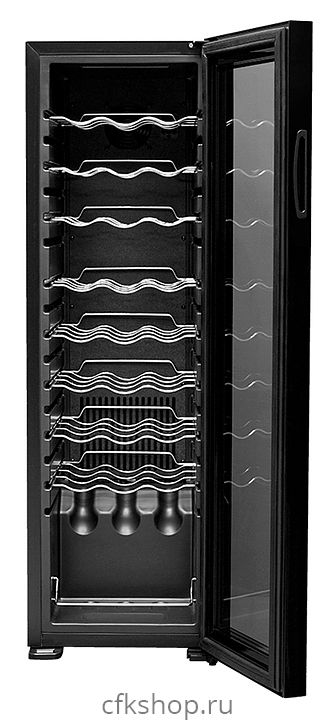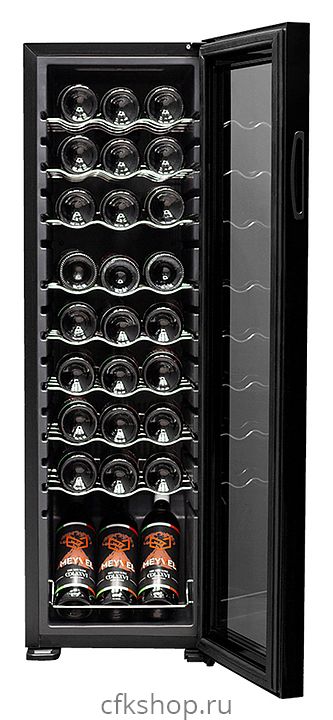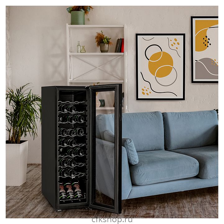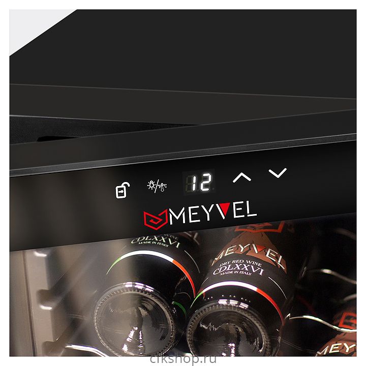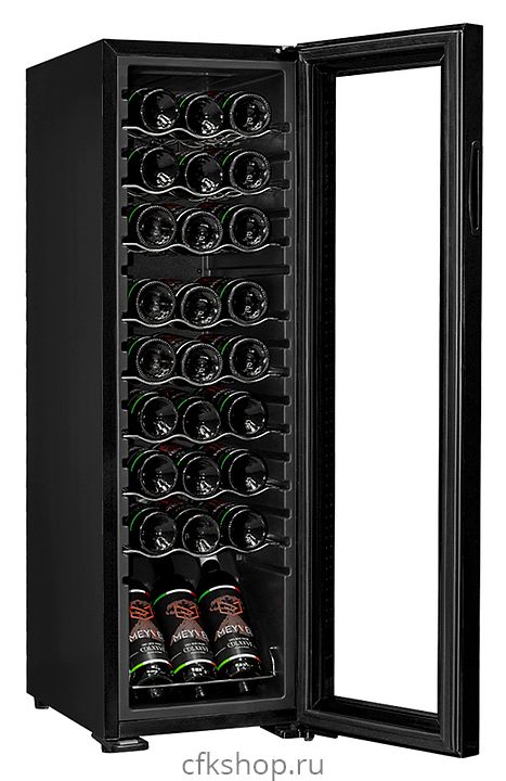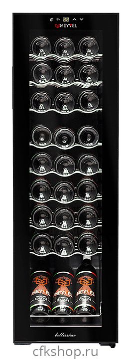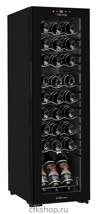 Винный шкаф MEYVEL MV27-CBD1 предназначен для демонстрации, хранения и создания оптимальных условий для сохранения всех вкусовых свойств вина в бутылках на предприятиях общественного питания, торговли, в барах, ресторанах, специализированных магазинах, частных домах или квартирах. Модель оснащена сенсорной панелью управления, электронным термостатом и светодиодной подсветкой белого цвета. Корпус выполнен из окрашенной в черный цвет стали, дверь - из пластиковой рамы и двойного стекла с защитой от ультрафиолетовых лучей, полки - из хромированного металла.