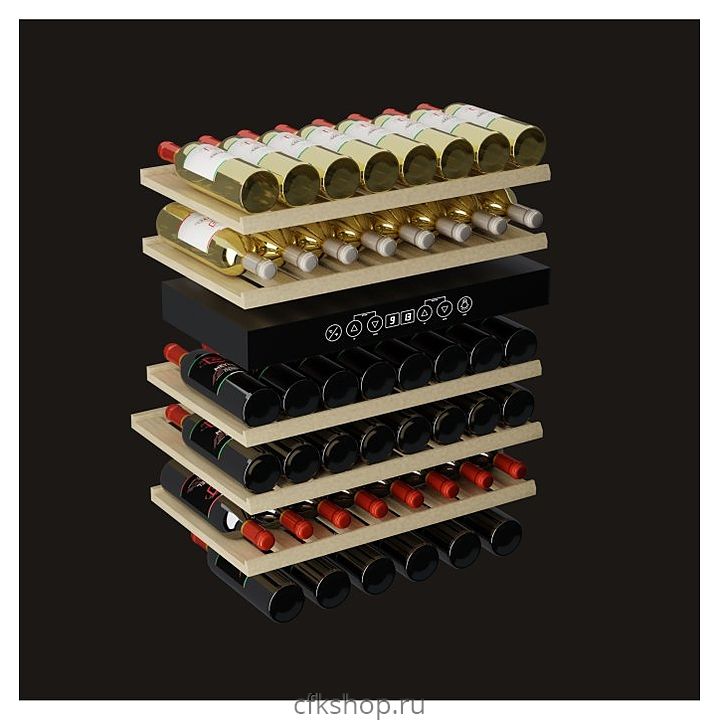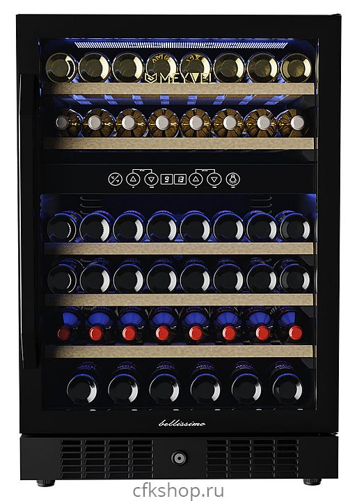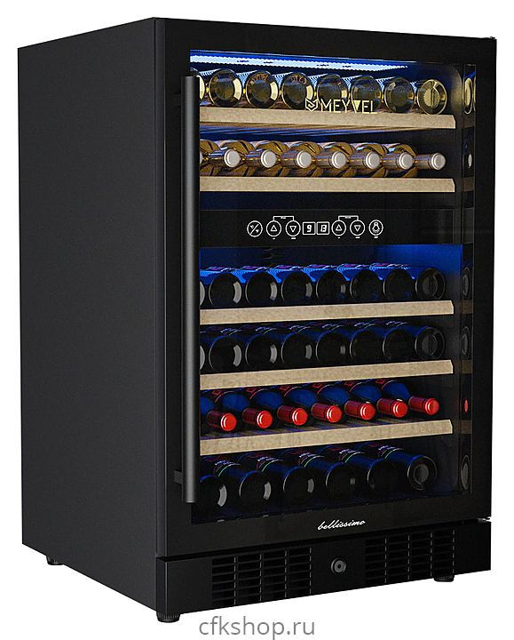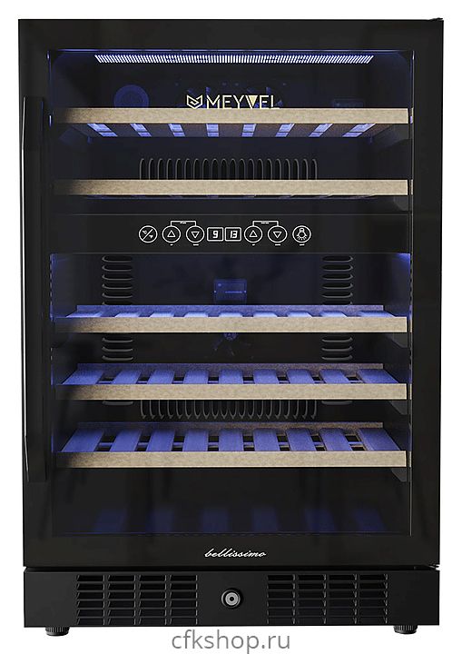 Винный шкаф MEYVEL MV46-KBT2 предназначен для демонстрации, хранения и создания оптимальных условий для сохранения всех вкусовых свойств вина в бутылках на предприятиях общественного питания, торговли, в барах, ресторанах, специализированных магазинах, частных домах или квартирах. Модель оснащена сенсорной панелью управления, 2 электронными термостатами, замком и синей внутренней светодиодной подсветкой. Корпус и дверная ручка выполнены из окрашенной в черный цвет стали, дверь - из двойного стекла с УФ защитой с черной рамкой, полки - из массива бука.