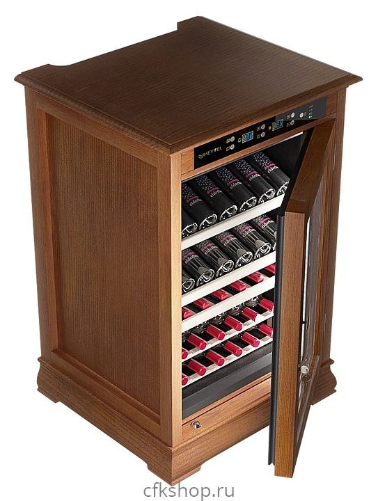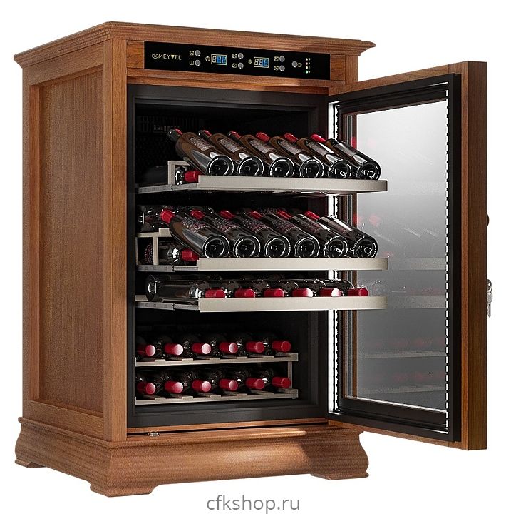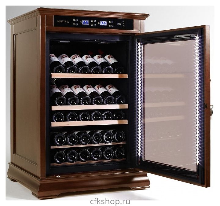 Винный шкаф MEYVEL MV46-WN1-C предназначен для демонстрации, хранения и создания оптимальных условий для сохранения всех вкусовых свойств вина в бутылках на предприятиях общественного питания, торговли, в барах, ресторанах, специализированных магазинах, частных домах или квартирах. Модель оснащена сенсорной панелью управления, электронным термостатом и светодиодной подсветкой. Корпус выполнен из обшитой деревом стали, дверь - из деревянной рамы и двойного стекла с защитой от ультрафиолетовых лучей, полки - из массива бука.