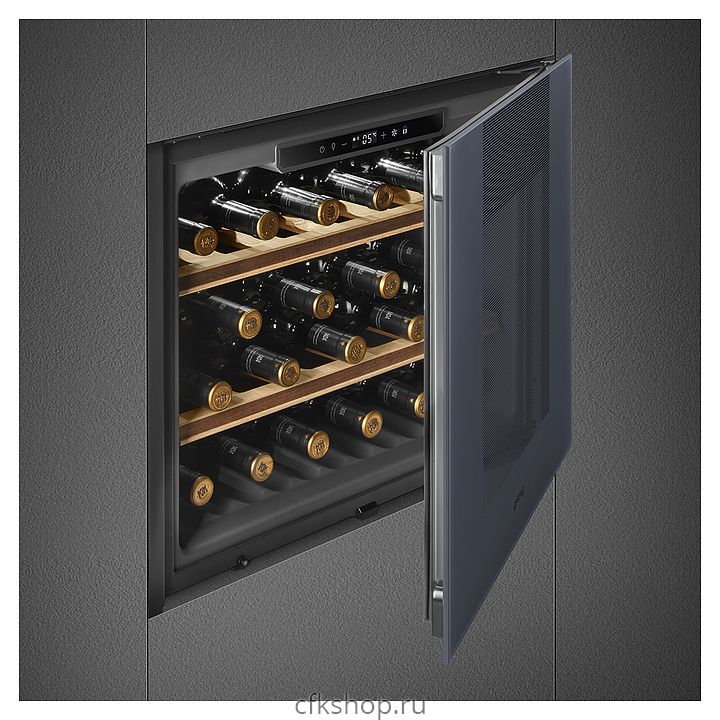 Винный шкаф SMEG CVI121G предназначен для охлаждения, хранения при оптимальных условиях и демонстрации бутилированного вина различных сортов в гостиницах и домашних условиях. Модель оснащена монотемпературной холодильной камерой с интегрированной в основание стационарной и 2 выдвижными полками с направляющими для размещения бутылок, распашной дверью на перенавешиваемых петлях с обзорным окном, внутренней сенсорной панелью управления с жидкокристаллическим цифровым дисплеем и белой подсветкой индикации. Корпус выполнен из металла, боковины с антикоррозийным покрытием порошковой краской, фронт серого оттенка Neptune Grey c полным внешним остеклением с глянцевой поверхностью без винтового крепежа, выдвижные полки – из массива древесины светлой породы.