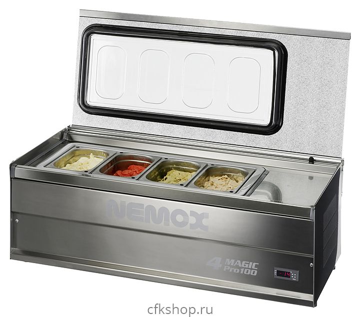Настольная витрина для мороженого Nemox 4 Magic Pro100 используется в барах, кафе, на открытых летних площадках, в специальных отделах супермаркетов и торговых центрах для демонстрации и кратковременного хранения мороженого, сорбета и других продуктов. Модель оснащена электронным управлением с дисплеем. Корпус и гастроемкости выполнены из нержавеющей стали, крышка - из двойного стекла.