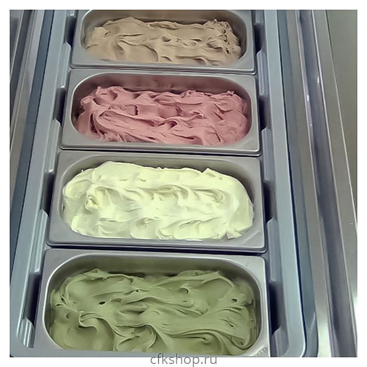 В комплект поставки входят 4 гастроемкости с крышками из поликарбоната и 4 лопатки для мороженого.