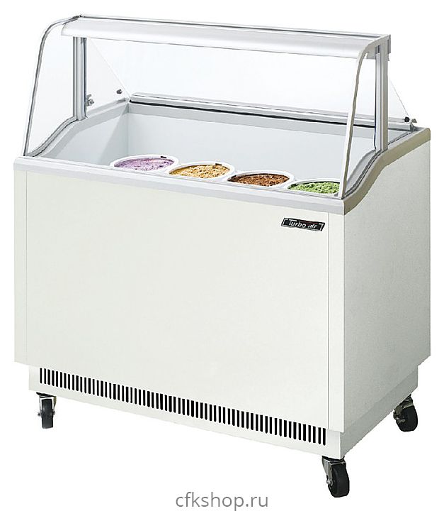 Витрина для мороженого Turbo air TIDC-47W используется на предприятиях общественного питания и торговли для демонстрации и хранения мороженого. Система креплений для контейнеров с мороженым выполнена из винилового покрытия, гладкая изогнутая крышка - из стекла.