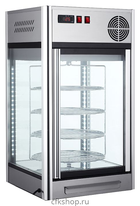 Кондитерская витрина Cooleq CW-108 предназначена для демонстрации, охлаждения и кратковременного хранения тортов, пирожных, фруктовых десертов и пиццы на предприятиях общественного питания и торговли. Модель оснащена регулятором температуры, двойным стеклом, замком, 4 вращающимися круглыми хромированными полками и LED-подсветкой с 2 сторон.