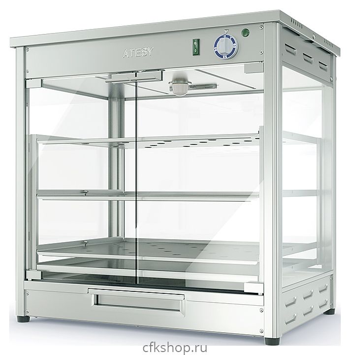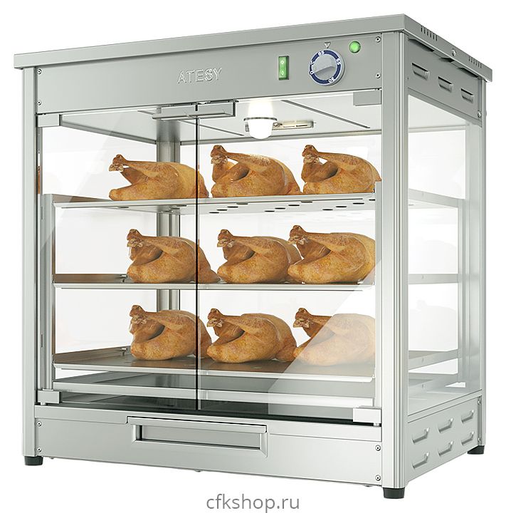 Тепловая витрина ATESY ВК-4 Э используется на предприятиях общественного питания и торговли для кратковременного хранения и демонстрации приготовленных тушек или частей кур, горячих закусок и вторых блюд в горячем виде. Модель оснащена 3 выдвижными перфорированными полками для выкладки продуктов и готовых блюд. Каркас и полки выполнены из пищевой нержавеющей стали AISI 430, корпус - из стекла.