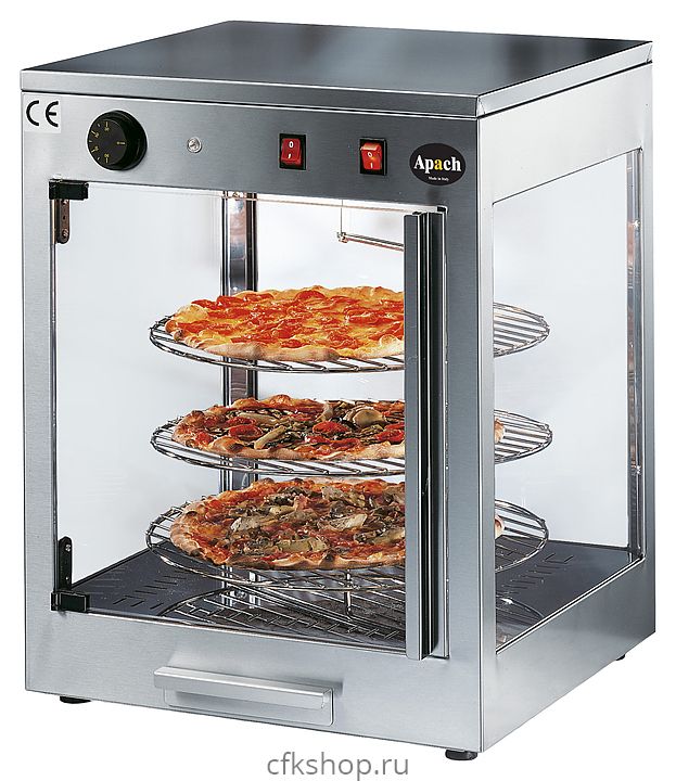 Тепловая витрина Apach AVT42 предназначена для демонстрации, подогрева и поддержания в теплом состоянии пиццы на предприятиях общественного питания и торговли. Модель оснащена дверцей с магнитным замком, 3 вращающимися полками-решетками и емкостью для сбора воды. Корпус выполнен из нержавеющей стали.