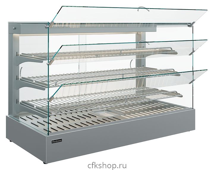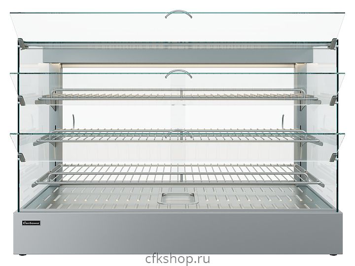 Тепловая витрина Carboma AC45 HWB 0,9-1 (self) серии Asia используется в небольших барах и кафе, на предприятиях общественного питания и торговли для поддержания в горячем состоянии, кратковременного хранения, демонстрации и продажи различных закусок и блюд, пиццы и выпечки. Модель оснащена системой пароувлажнения (типа мармит), задними створками-слайдерами, 3 полками-решетками с возможностью регулирования угла, термометром, термостатом и выдвижным поддоном для сбора крошек. Корпус и полки выполнены из нержавеющей стали.
