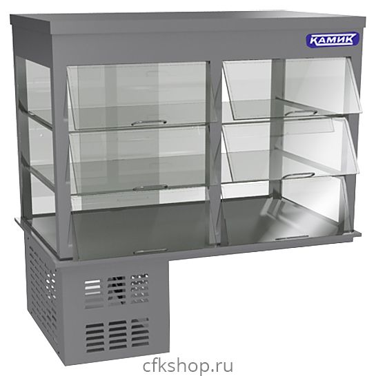 Встраиваемая витрина КАМИК ВХ-12060 используется на предприятиях общественного питания и торговли для охлаждения, демонстрации и кратковременного хранения продуктов и готовых блюд. В правой нижней части конструкции расположен холодильный агрегат. Корпус выполнен из нержавеющей стали AISI 430 и AISI 304 толщиной 1 мм, полки - из стекла.