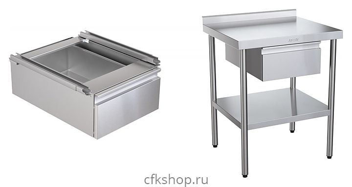 Подвесной ящик ATESY ЯВ-1.1-02 предназначен для установки под столешницу столов серии СР-С и СР-П шириной 600 / 700 / 800 мм. Монтаж осуществляется шурупами к подложке столешницы. Корпус и выдвижной ящик выполнены из нержавеющей легированной стали AISI 430.