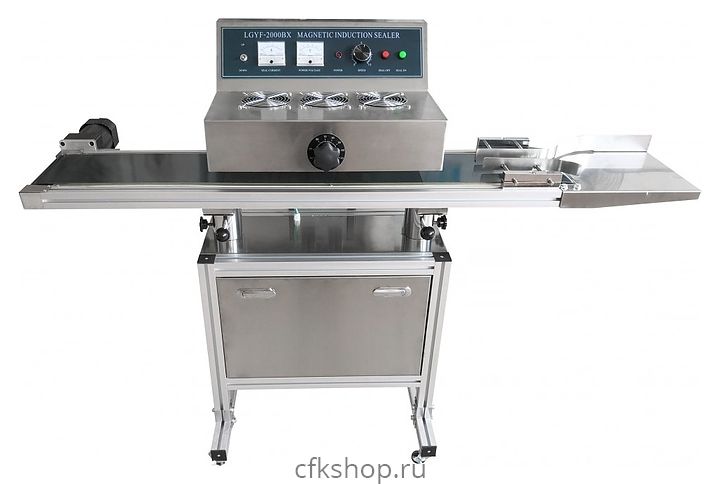 Напольный индукционный запайщик Hualian LGYF-2000BX используется на предприятиях общественного питания, торговли, пищевой, химической, фармацевтической и других напрвлений промышленности для герметичной упаковки пищевых и не пищевых продуктов в стеклянной или пластиковой таре с круглой формой горловины предварительно помещенным под крышку композитным вкладышем. Принцип работы запаечного блока основан на непосредственном нагреве металлической поверхности вкладыша создаваемыми высокочастотным магнитным полем индуцированными вихревыми токами и сваривании разогретого таким образом полимерного слоя вкладыша с кромкой горловины. Модель оснащена горизонтальным ленточным конвейером, загрузочной столешницей и расположенной сверху наклонной электромеханической панелью управления.